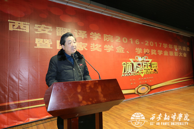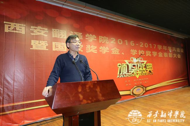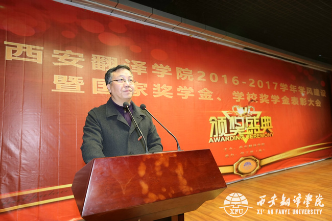 | 副校长兼教务长齐玉水宣读《西安翻译学院2016-2017学年学风建设先进集体、先进个人表彰决定》 |