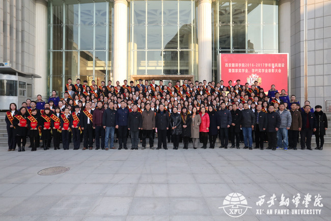 副校长兼教务长齐玉水首先宣读了《西安翻译学院2016-2017学年学风建设先进集体、先进个人表彰决定》。为展示我校学生学习风貌,树立典型,经各班级民主评选、院系初审、学生工作部(处)审核并全校公示,报学校学生资助工作领导小组批准,决定授予151110106班等42个班级为2016-2017学年“先进班集体”荣誉称号;授予155110201班等152个班级为2016-2017学年“优良学风班”荣誉称号;授予东二103等278个宿舍为“文明宿舍”荣誉称号;授予张成等16名同学“国家奖学金”荣誉称号;授予毛奕婷等445名同学“国家励志奖学金”荣誉称号;授予杜雪等72名同学“学校一等奖学金”荣誉称号;授予赵静等280名同学“学校二等奖学金”荣誉称号;授予白雪等546名同学“学校三等奖学金”荣誉称号;授予郭慧等733名同学“优秀学生干部”荣誉称号;授予李心茹等9名同学“利民奖学金”荣誉称号;授予韩英等23名同学“利民助学金”荣誉称号;授予王浩等10名同学“创新之星”荣誉称号;授予王旭等5名同学“创业之星”荣誉称号;授予鼎新网络工作室等5个团队“优秀创业团队”荣誉称号;授予张泽艳等25名同志“先进工作者”荣誉称号。学校希望受表彰的集体与个人珍惜荣誉、再接再厉,在学校学风建设活动中发挥模范带头作用,以更加优异的成绩回报学校、回报社会、回报国家。齐玉水号召全体师生向先进看齐,勤奋学习、努力工作,刻苦钻研、积极进取,不断提升自身素质和能力,为“建成具有地方示范作用的民办大学”的目标和中华民族伟大复兴“中国梦”的实现做出贡献。